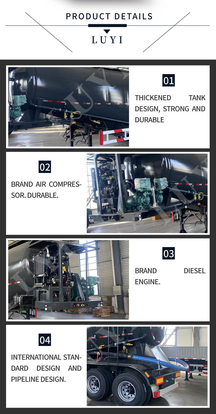 Avec des dimensions de 11 200 × 2 500 × 3 800 mm, il est fabriqué en acier de haute qualité, équilibrant résistance structurelle et durabilité. Le nombre d'essieux peut être personnalisé de manière flexible jusqu'à 2/3/4 et ils proviennent des marques bien connues FUWA et BPW. Il est associé à une suspension mécanique ou pneumatique en option pour garantir la stabilité et l'adaptabilité de la conduite ; les spécifications des pneus peuvent être personnalisées en fonction des exigences du client pour répondre aux besoins des différentes conditions routières. De plus, le produit est assorti d'une garantie de 6 ans pour un service après-vente suffisant, et sa couleur permet également une personnalisation personnalisée, répondant pleinement aux divers besoins dans les scénarios de transport de ciment en vrac et servant de partenaire de transport fiable.