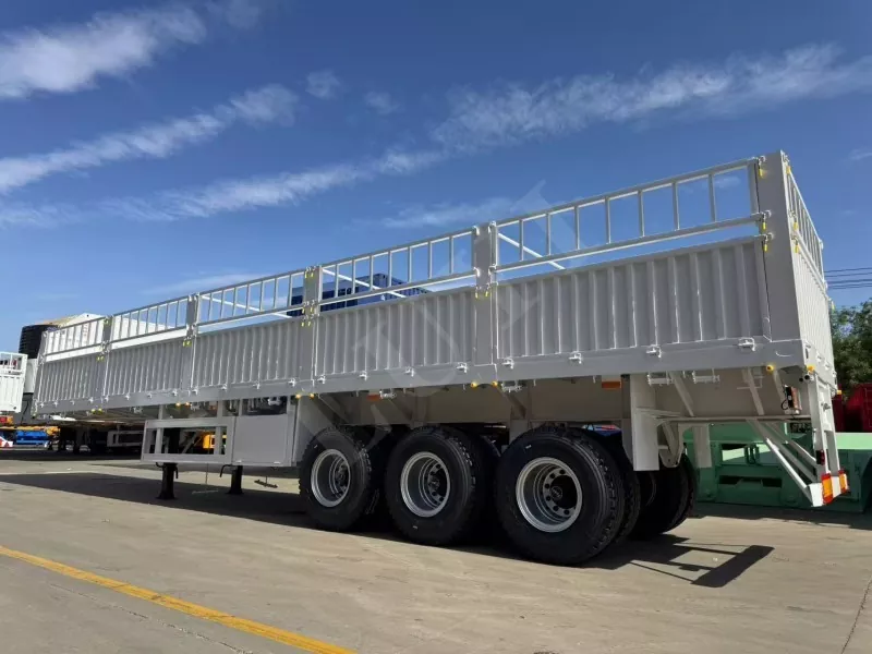 Notre semi-remorque bleu à 3 axes mesure 12,5 mètres de long et 2,5 mètres de large. La hauteur du faisceau de véhicule est de 500 (mm), la plaque d'aile supérieure est de 20 * 200 (mm), la plaque d'aile inférieure est de 20 * 200 (mm) et la toile est de 12 (mm). Matériaux utilisés: Plaque de manganèse Q345B, poutre en I lourde et durable, soudé par le processus de soudage à l'arc submergé automatique. La hauteur du LIVRe est de 600 mm, 3x13t Guangdong Fuhua Brand ou BPW Brand. Nous utilisons des pneus 315 / 80R22.5, une suspension mécanique à trois points, des ressorts à feuilles lourds, des ABS WABCO, des stabiliseurs de traction et des épingles de traction, des vannes de relais WABCO, des circuits électriques 24 V, des phares LED, une conception de pare-chocs anti-collision et équipé d'une boîte à outils de grande taille. L'ensemble du véhicule adopte un processus de pulvérisation en poudre spécial et est pulvérisé avant de quitter l'usine pour assurer la sécurité du transport maritime.