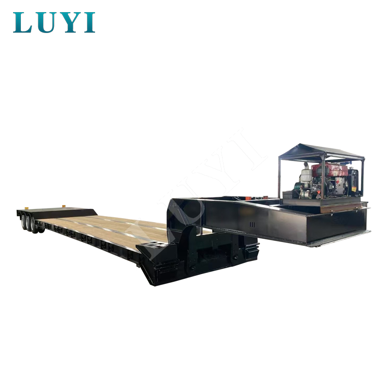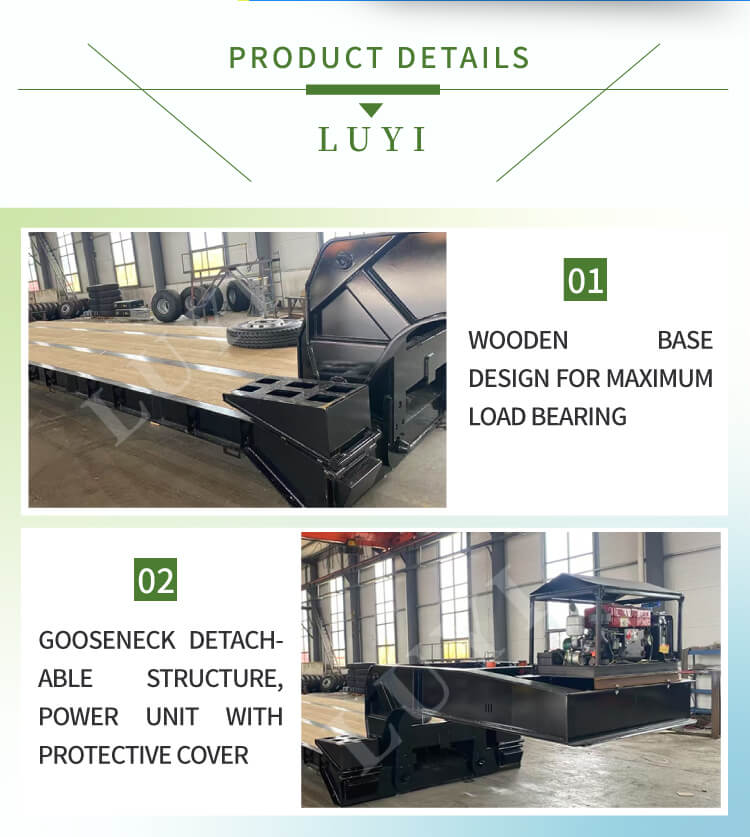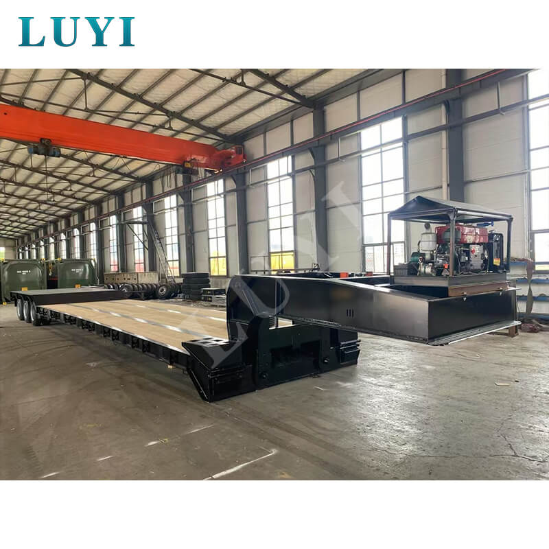 Produite par Luyi Vehicle à Shandong, en Chine, la semi-remorque surbaissée à col de cygne amovible à 3 essieux est une solution de transport lourd fiable avec une charge utile maximale de 100 tonnes. Il mesure 15 000 × 3 000 × 1 800 mm, répondant parfaitement aux besoins des applications de remorques de camions.