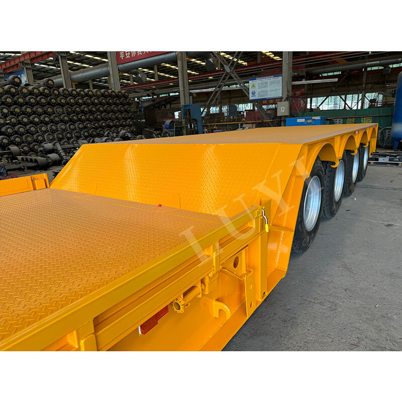 La remorque offre une suspension mécanique ou pneumatique en option, associée à des ressorts à lames 90 (largeur) × 13 (épaisseur) × 10 (couches) et des pneus 12R22.5/12.00R20/11R22.5 en option, assurant stabilité et fiabilité.transport capable. Il est également équipé de pieds de support standard JOST de 28 tonnes pour une forte stabilité. La marque Luyi construit des produits de qualité avec des matériaux solides et un savoir-faire exquis, offrant une solution sûre et efficace pour le transport longue distance d'équipements lourds.