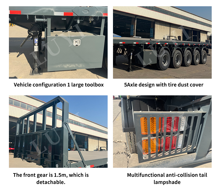 La couleur du corps prend en charge une personnalisation personnalisée, réglable en fonction des exigences du client pour répondre aux besoins d'utilisation et d'affichage de différents scénarios. Avec les principaux avantages d'une capacité de charge élevée, d'une forte adaptabilité et de performances stables, la semi-remorque plateau à 5 essieux LUYI se distingue comme l'équipement préféré pour des opérations efficaces dans l'industrie du transport de matériaux de construction, aidant les utilisateurs à réduire les coûts, à augmenter l'efficacité et à exceller dans la course logistique.