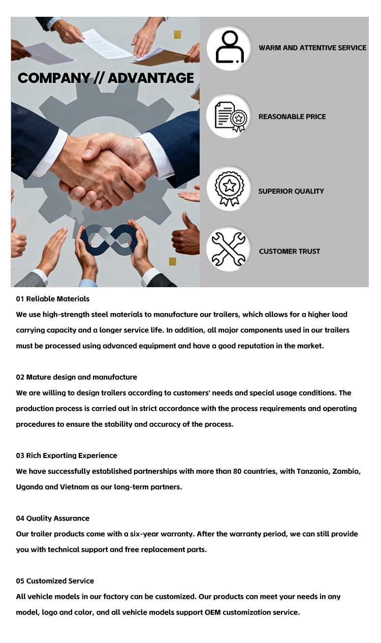 Envoyez-nous votre demande pour obtenir un devis personnalisé basé sur vos besoins réels de transport. Faites-nous savoir le type de remorque, la cargaison ou la charge utile, les conditions routières, la destination et la quantité, et notre équipe vous répondra avec une recommandation appropriée dans les plus brefs délais.
