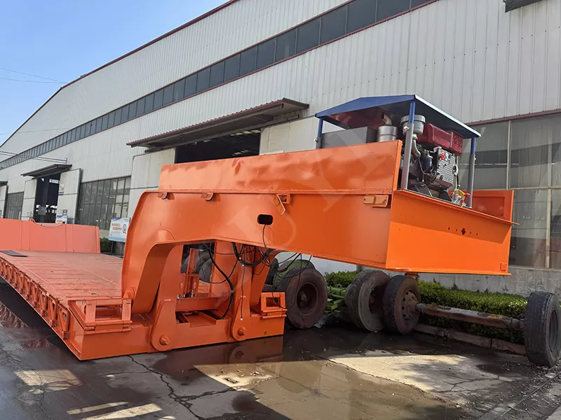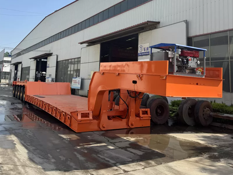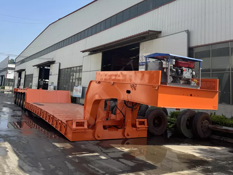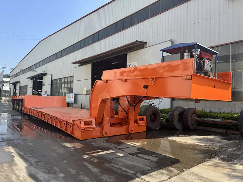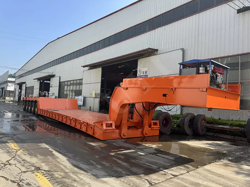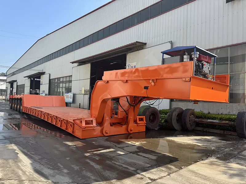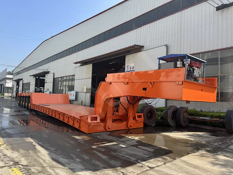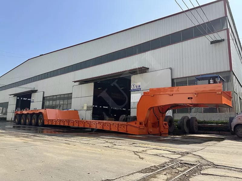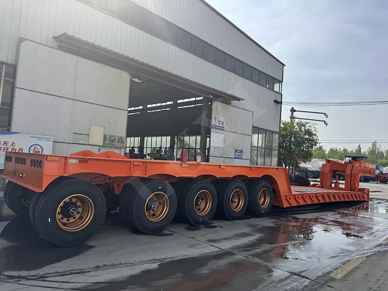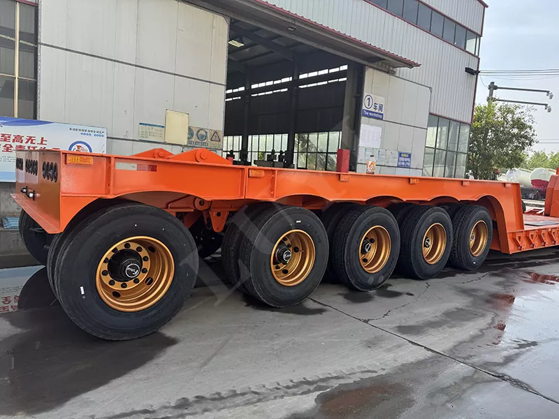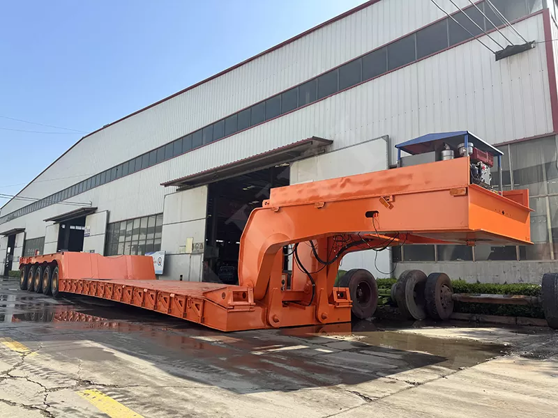 L'essieu arrière de la semi-remorque à lit basse à lit d'oie détachable à 5 essieux peut être plié et retiré, et peut transporter 150 tonnes de gros cargaison. Il peut transporter de grandes excavateurs, de grands chargeurs, de grands véhicules de robot et un transport de marchandises ultra-longs et ultra-large, des véhicules spéciaux à grand équipement, etc.