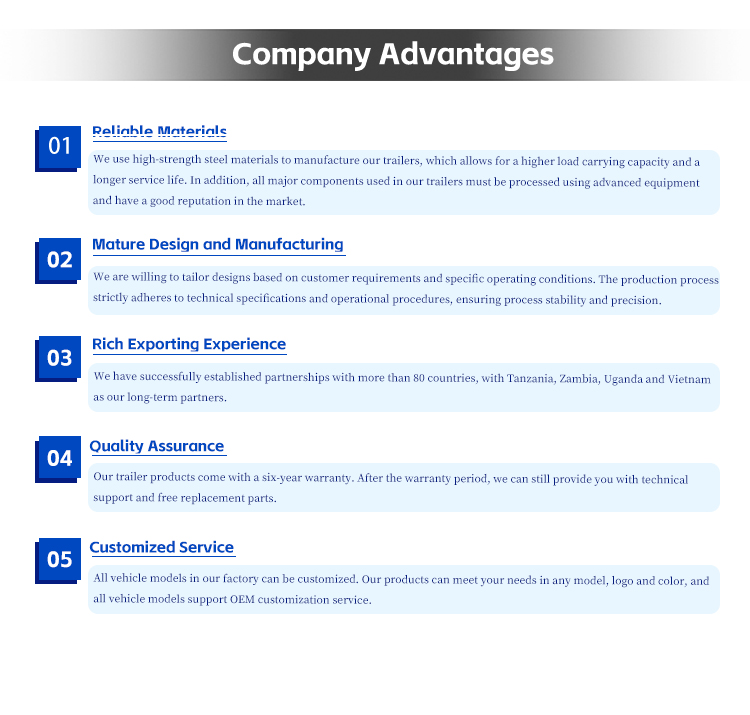 Envoyez-nous votre demande pour obtenir un devis personnalisé basé sur vos besoins réels de transport. Faites-nous savoir le type de remorque, la cargaison ou la charge utile, les conditions routières, la destination et la quantité, et notre équipe vous répondra avec une recommandation appropriée dans les plus brefs délais.