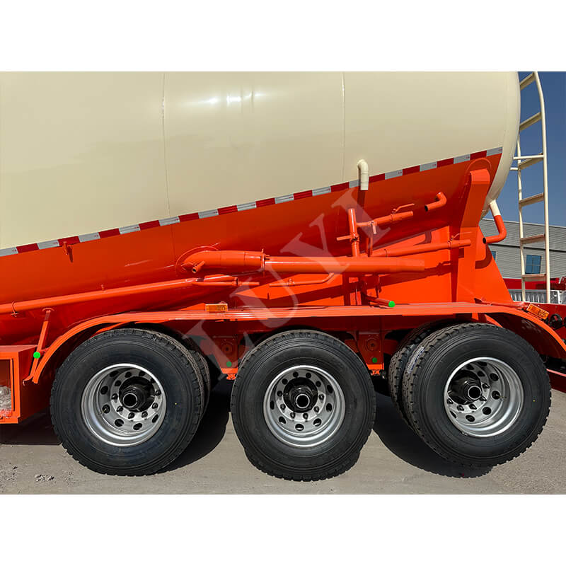 Les dimensions de la remorque sont de 10 500 × 2 550 × 4 000 mm. Il est équipé de deux options de suspension mécanique/pneumatique, associées à une structure stable à 3 essieux et à des stabilisateurs robustes de 28 tonnes pour assurer la stabilité pendant le stationnement et la conduite. Le système de freinage à double conduite améliore la sécurité. Les options de pneus incluent diverses spécifications telles que 11.00r20 et 12r22.5, et le pivot d'attelage est disponible en deux modèles : JOST 50 mm / 90 mm. De plus, la couleur peut être personnalisée en fonction des besoins, s'adaptant pleinement aux différents scénarios de transport et exigences esthétiques, ce qui en fait un équipement fiable pour le transport de ciment en vrac.