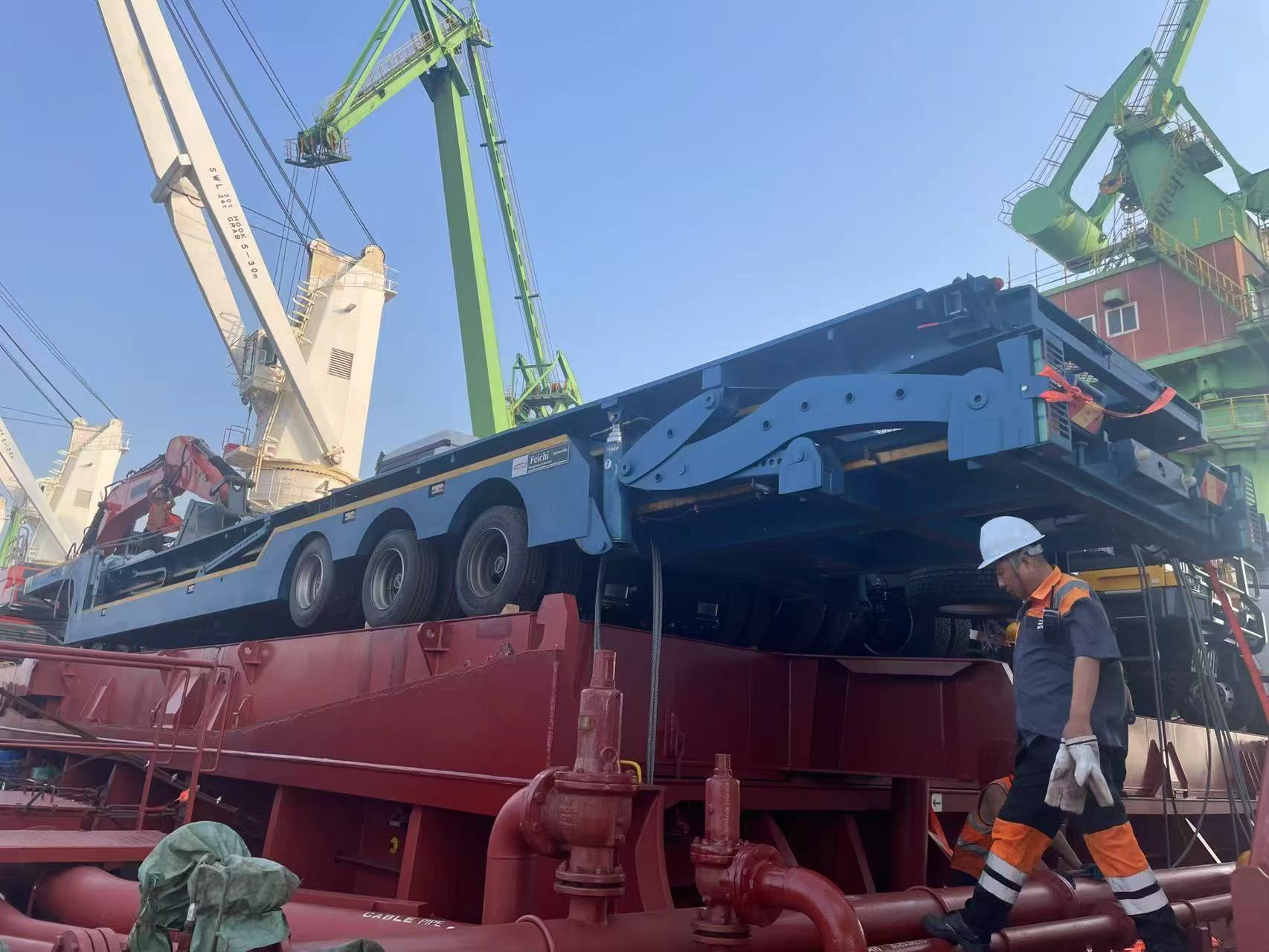 Comme le dernier LuyiSemi-remorque à plateau 3 essieux 4 piedsa été fixé à bord, le cargo océanique a lentement quitté le port. L'exportation de ces semi-remorques à plateau reflète non seulement la force du produit de la marque Luyi, mais représente également le lien précis entre la fabrication d'équipements chinois et les besoins du marché d'Asie centrale. À l'avenir, avec la mise en service des semi-remorques à plateau Luyi à 3 essieux et 4 pieds au Kazakhstan, cela améliorera efficacement l'efficacité du transport technique local, donnera une impulsion à l'avancement des projets d'infrastructure locaux et ouvrira en même temps un espace de marché étranger plus large pour les semi-remorques à plateau Luyi, favorisant ainsi l'entrée d'un plus grand nombre de semi-remorques à plateau Luyi sur la scène internationale.